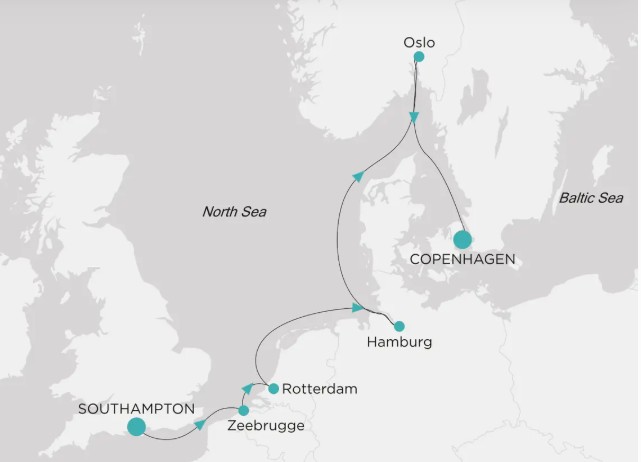 Southampton, Zeebruges/Bruges, Roterdã, Hamburgo, Oslo, Copenhague