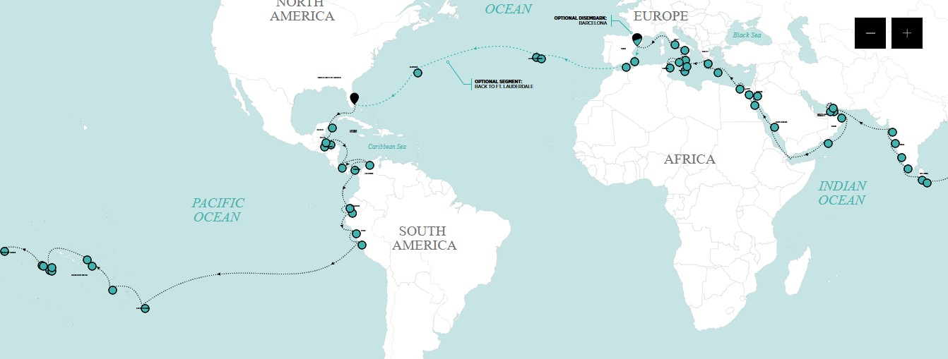 Partindo de Fort Lauderdale, esta jornada única percorre as costas da América Central e do Sul, atravessa o lendário Canal do Panamá e segue rumo à exuberância tropical das ilhas do Pacífico Sul. Navegamos pelas paisagens cinematográficas da Nova Zelândia e da Austrália, avançamos pelas especiarias, cores e espiritualidade do Sudeste Asiático e mergulhamos nos esplendores do Oriente Médio.